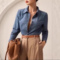 跨境2025秋季新款纯棉翻领长袖女式衬衫商务休闲日常通勤优